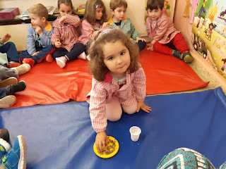 Nos ponemos el gorro que hicimos el día anterior que han lo decorado con su nombre y pegatinas.
